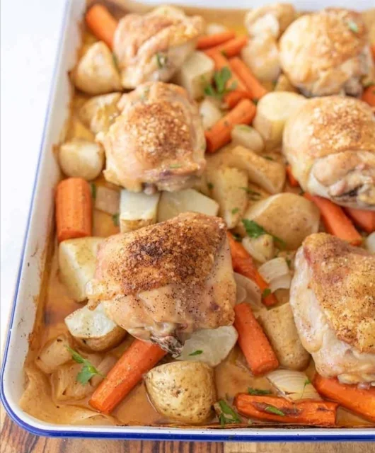 Seasoned to perfection with herbs, spices, and often a flavorful sauce or marinade, everything is then roasted in the oven until the chicken is juicy and the veggies are tender and caramelized.